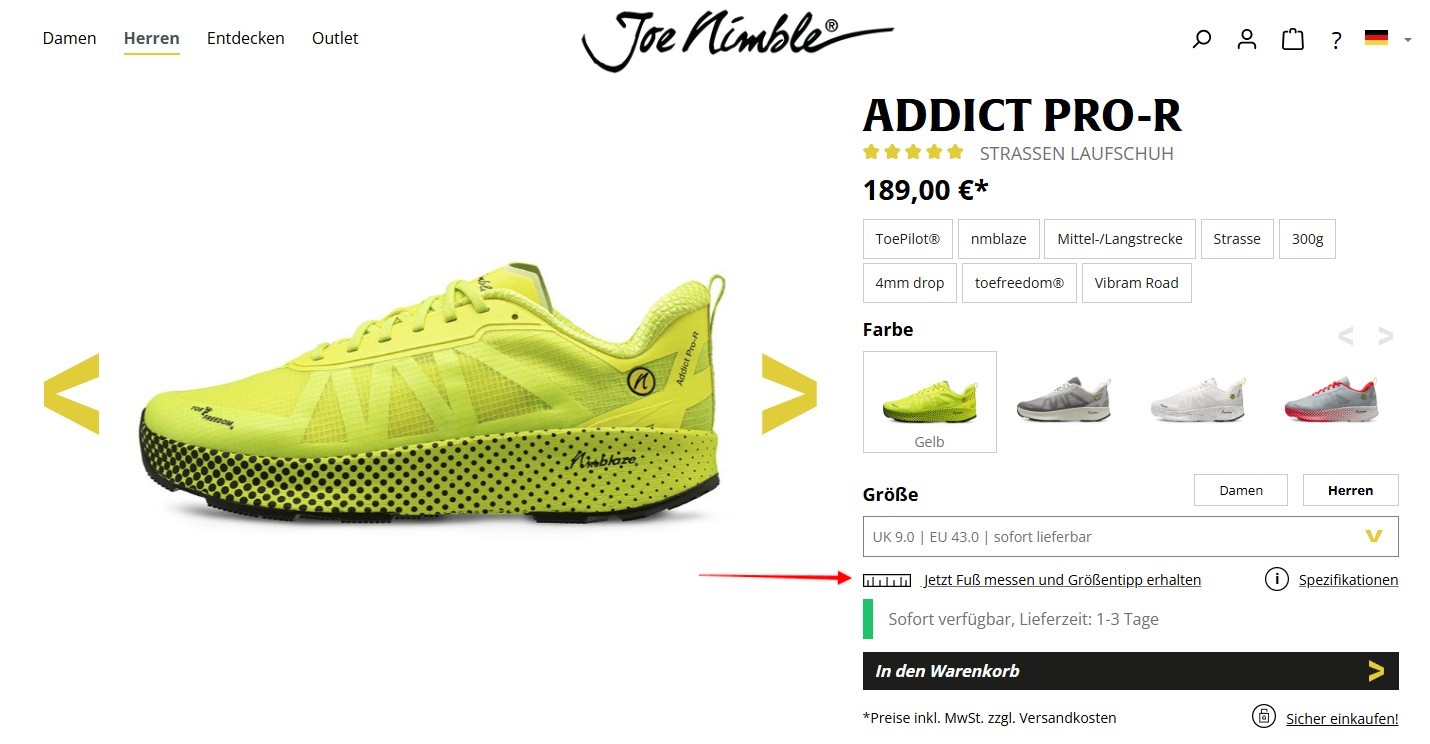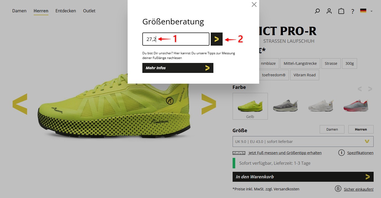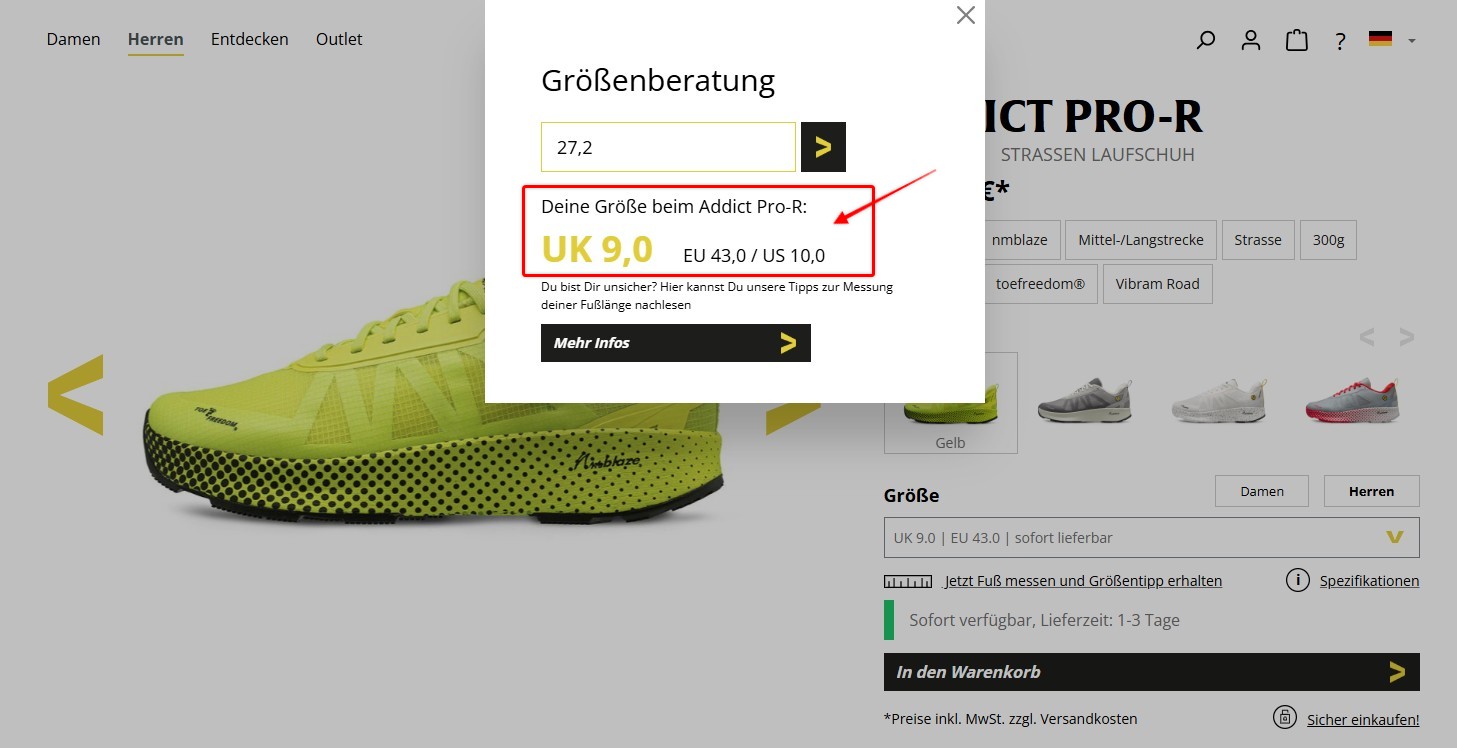 - Gehe zu dem Laufschuh, dort findest Du unter der Größenauswahl den Größenberater