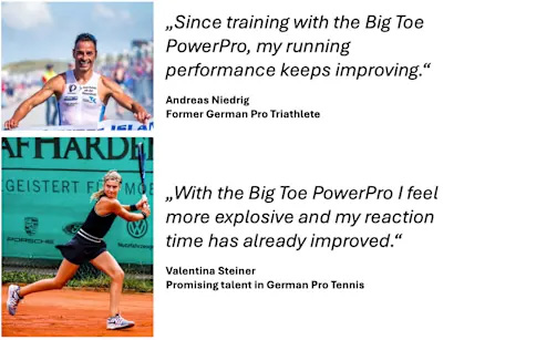 Just two simple exercises with the Big Toe PowerPro — taking only three minutes, four times a week — can make a powerful impact. In as little as 8 weeks, this focused routine strengthens the often-neglected foot muscles, especially the big toe, which plays a key role in speed, stability, and explosive power. The result: better performance in any sport.